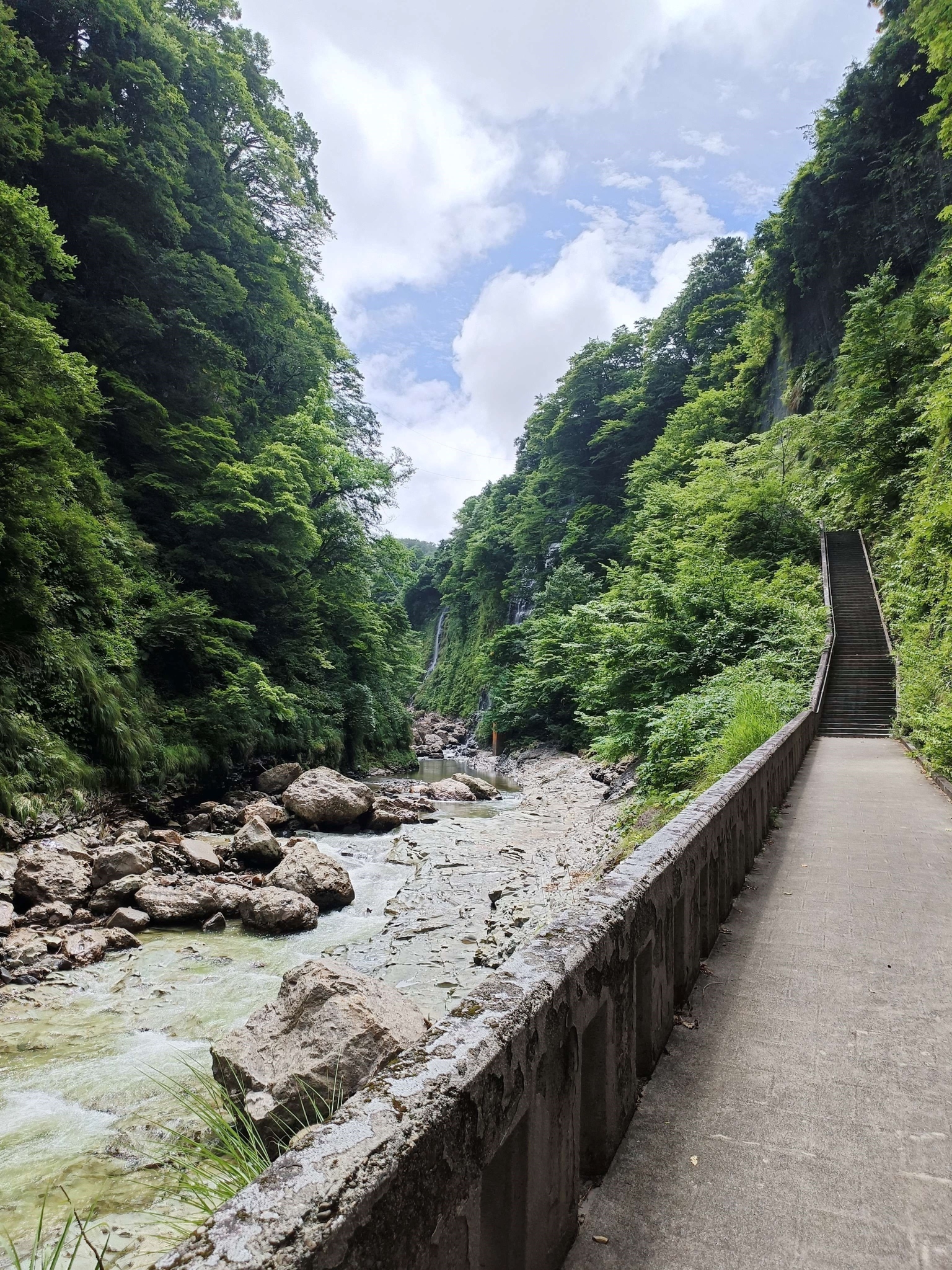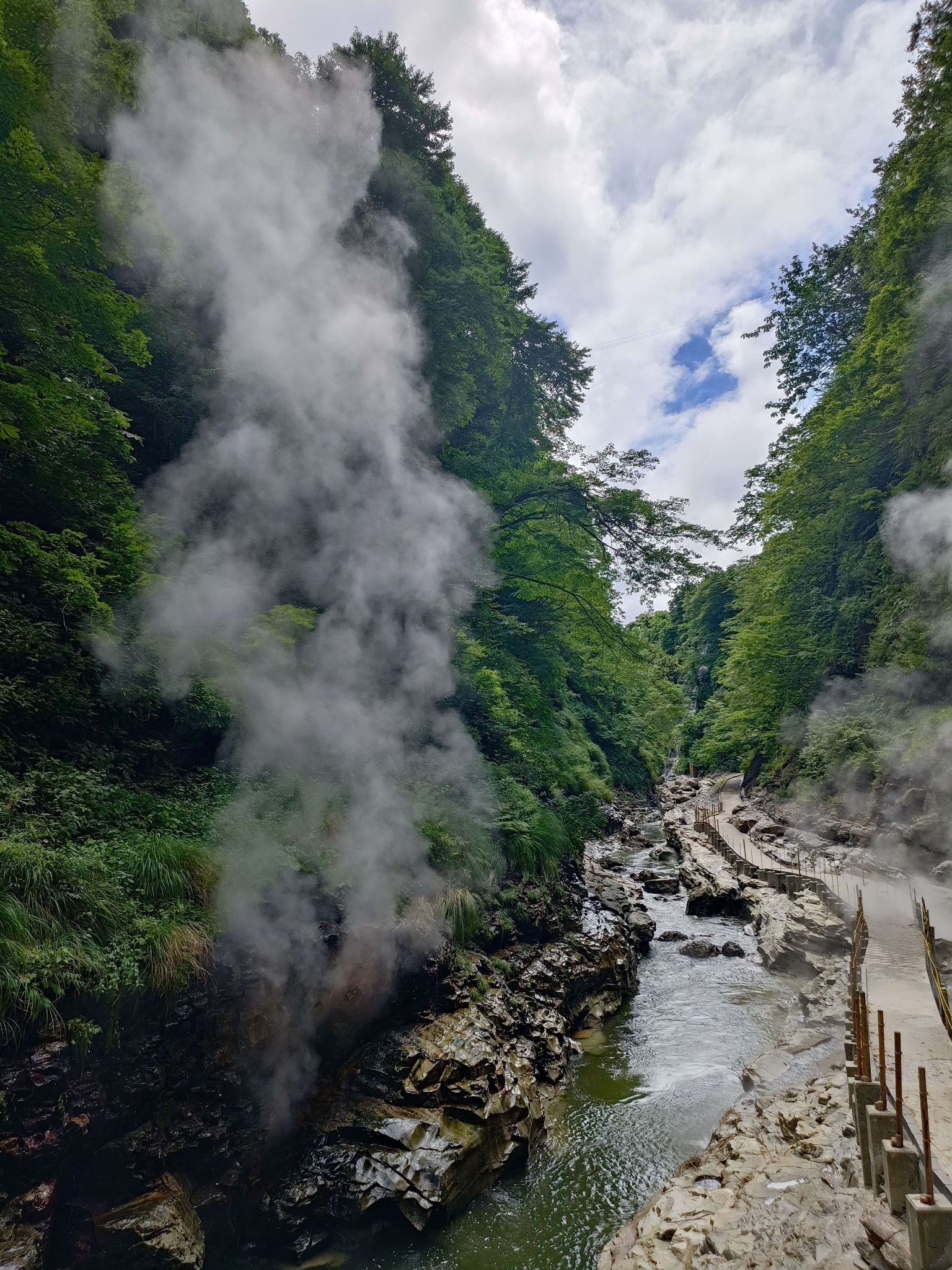 抵達最下面的步道之後,驀然回首遠方噴泉沿著懸崖向下為整個河川注入了活力。過河原湯橋的底下之後,從兩側山壁激烈地噴射出如同雷鳴般的熱水以及蒸氣遍佈著整個山谷。